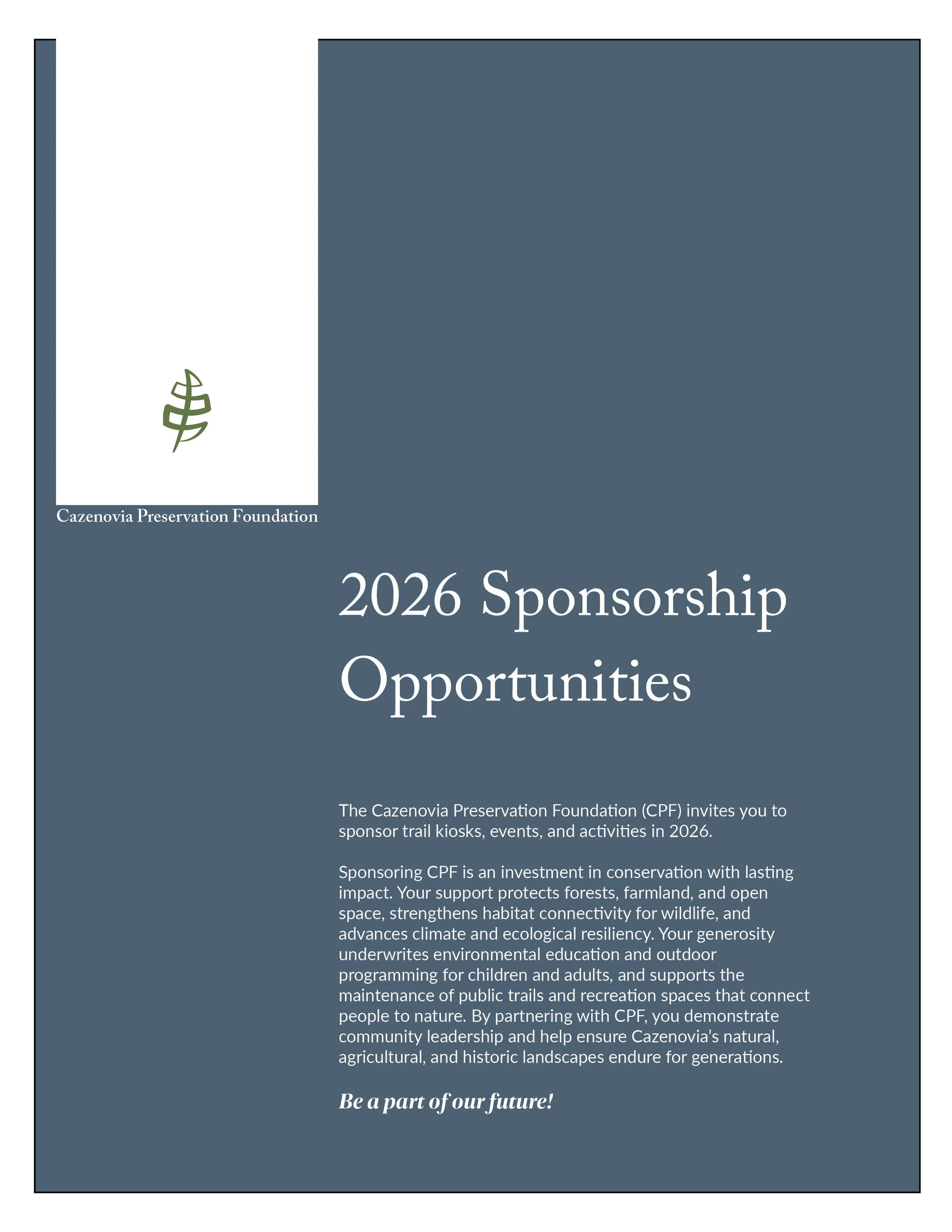 CPF invites you to sponsor an upcoming project, event, or activity. Whether you are an individual, foundation, or business, we have a variety of opportunities that will both benefit our community and provide you with special perks, recognition, and acknowledgement. Your sponsorship will support our ongoing conservation efforts and stewardship activities.
